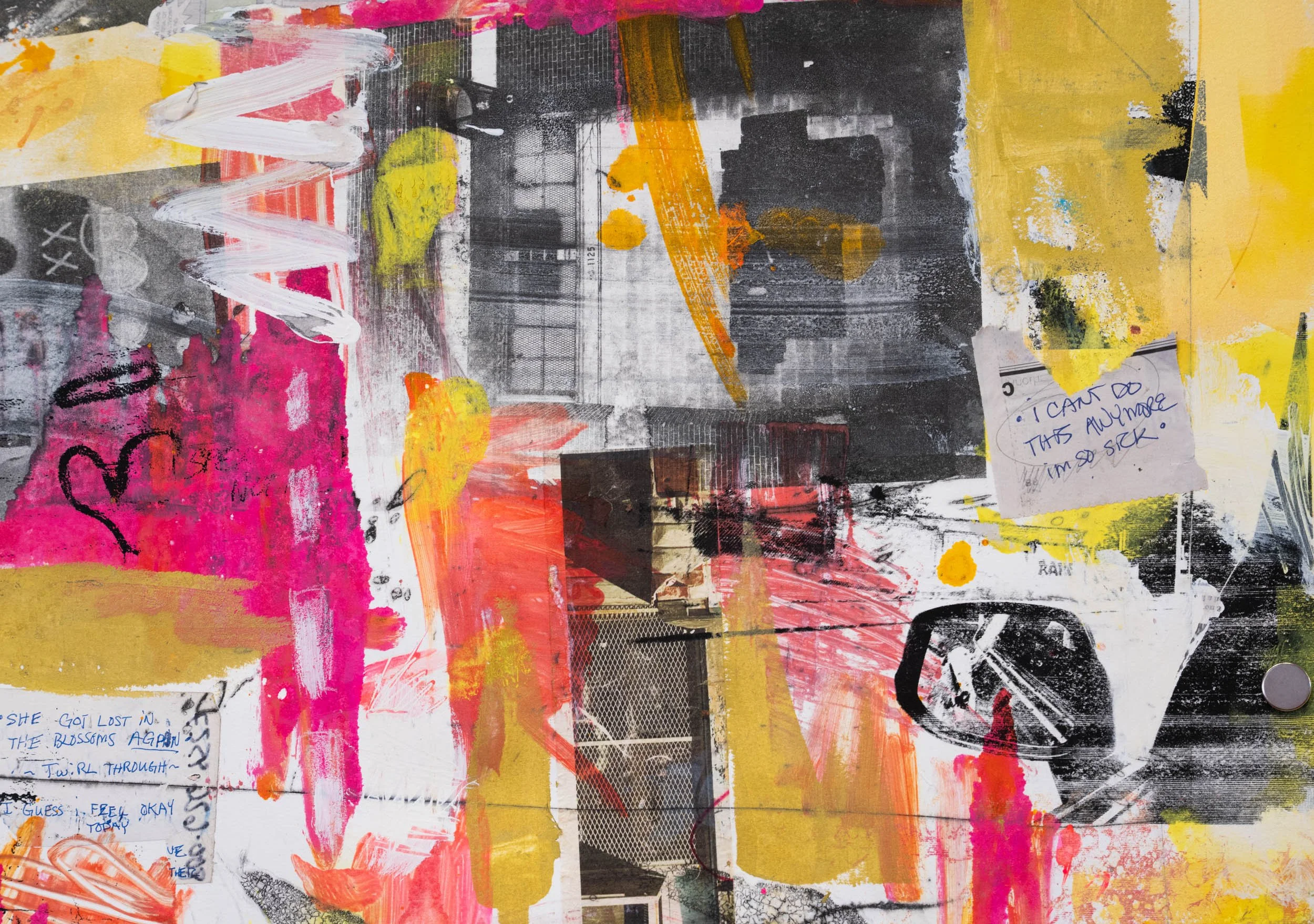 “Hella Oakland” was a period of self- investigation and solitude. The work process was a time of discovery and soul searching. I took a lot of risks and had many breakthroughs. I was transparent about my emotions and reactions to everyday objects in my path. Each piece is a narrative that relates to the next, and mimics moments that I had every day like in a film. The thoughts that I had when looking at these places on a constant meander was poetic for me. Graffiti and the street art in Oakland were motivations. I found myself attached to the street during this process. It uses photo-etching print process, viscosity and collage through the press.